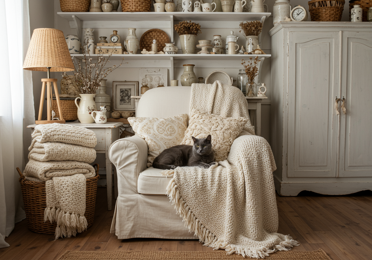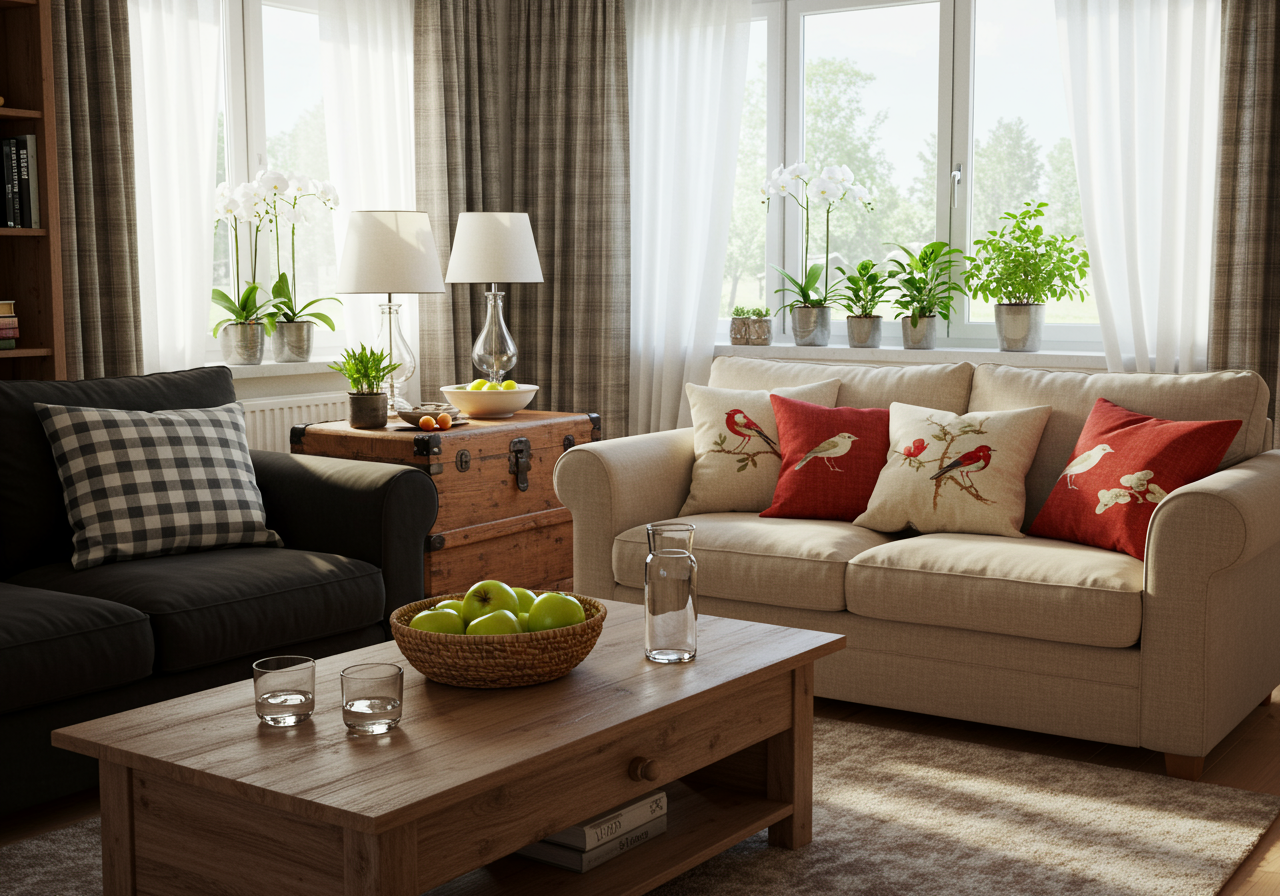 Country interior design is cozy and warm, drawing inspiration from rural life. It features rustic elements like wood beams, handcrafted furniture, and a warm colour palette with soft, muted tones. This style creates a welcoming and down-to-earth atmosphere, often featuring vintage and handmade items. Country design celebrates tradition and nostalgia, making it a comforting and charming choice for homes.Capture the warmth of a country-style holiday with cozy, rustic decor. Embrace a colour palette of reds, greens, and earthy tones. Decorate with handmade ornaments, like knitted stockings and wooden decorations. Incorporate plaid and gingham patterns for a cozy, traditional feel. Use natural elements like pinecones, twine, and burlap to add a touch of rustic charm.