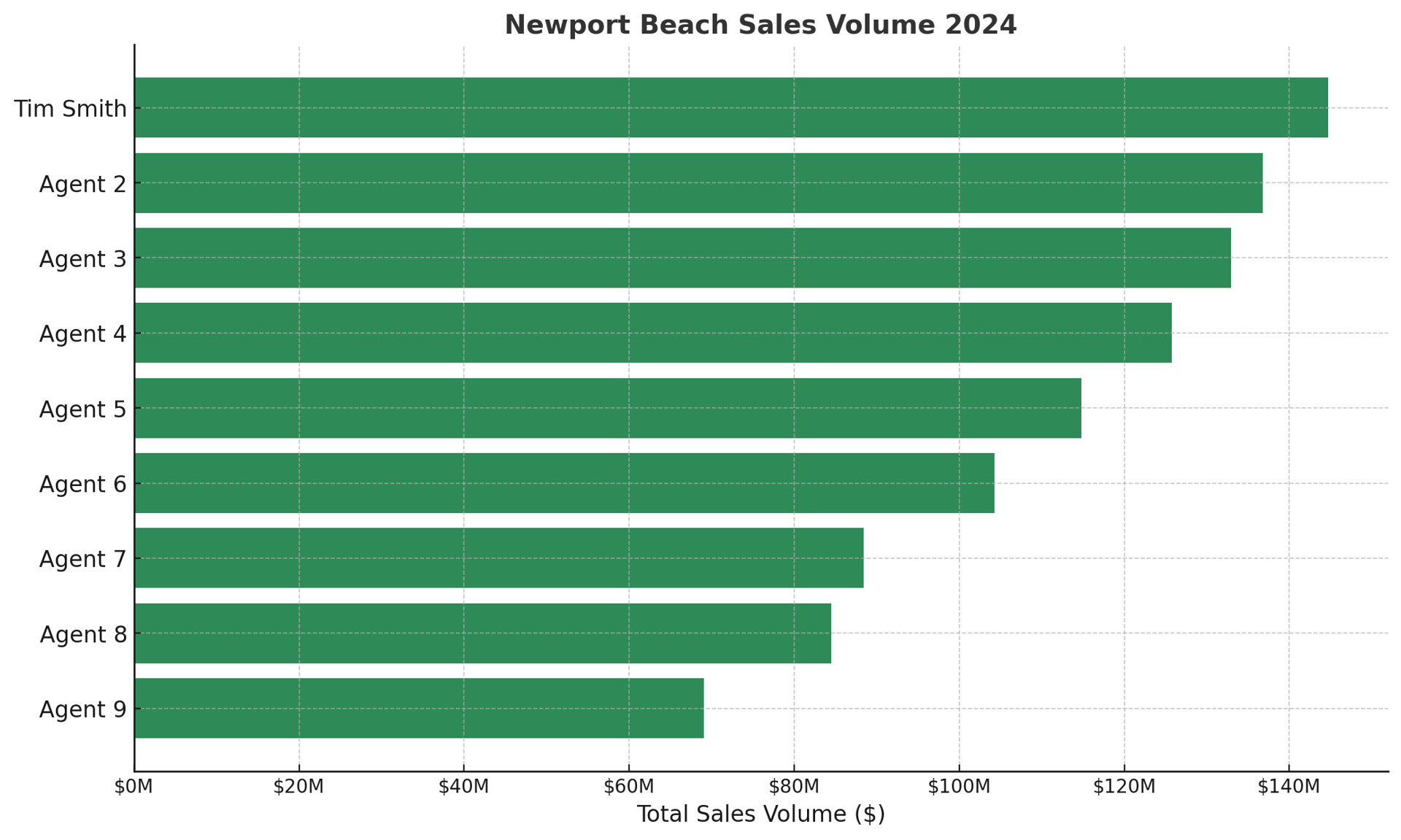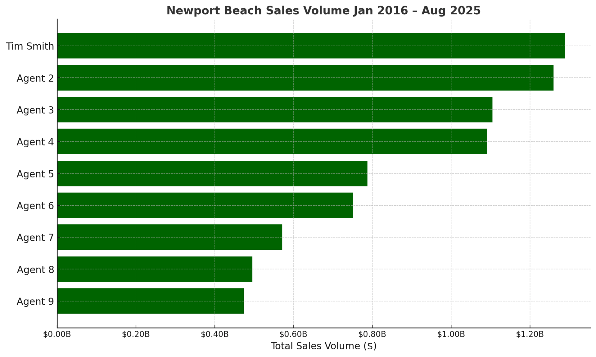 Beyond annual rankings, long-term performance is what truly sets a realtor apart. From January 2016 through August 2025, Tim Smith has closed more in sales volume in Newport Beach than any other agent**, reaching $1.28 billion in transactions. This record underscores both consistent client trust and an unmatched ability to deliver results.