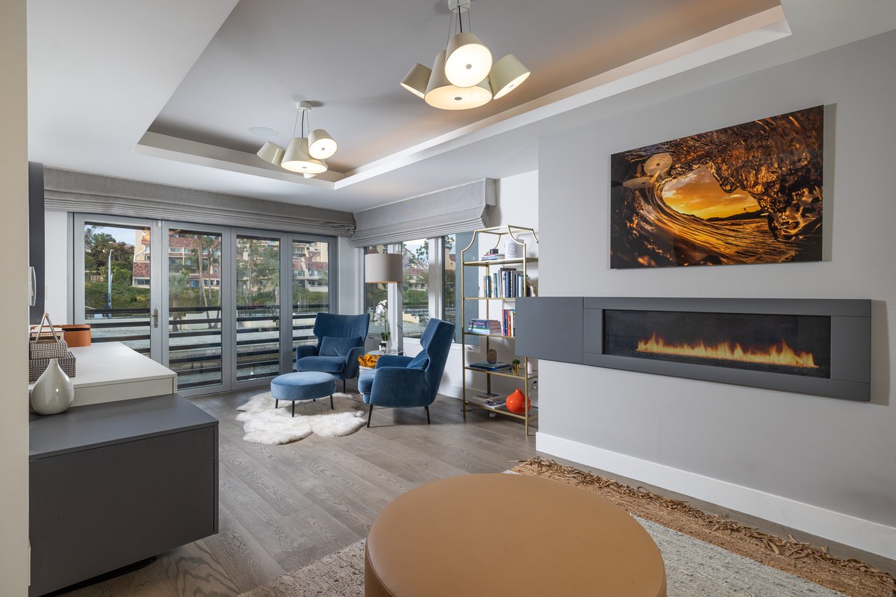 An ascent to the second level reveals the primary suite, a gym (which can serve as an optional fourth bedroom), a laundry room, and the third bedroom await, with the latter featuring an en-suite bath and French doors opening to a rooftop deck with a fireplace, refrigerator, and views of Balboa Island.